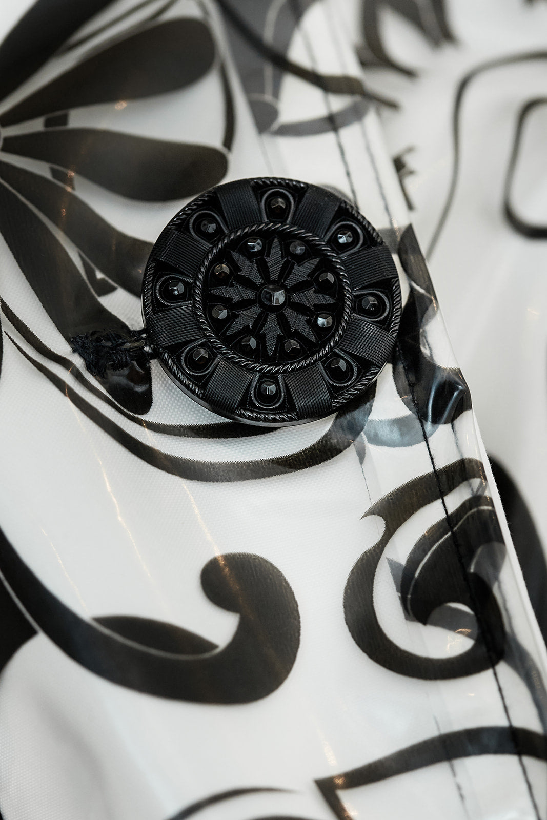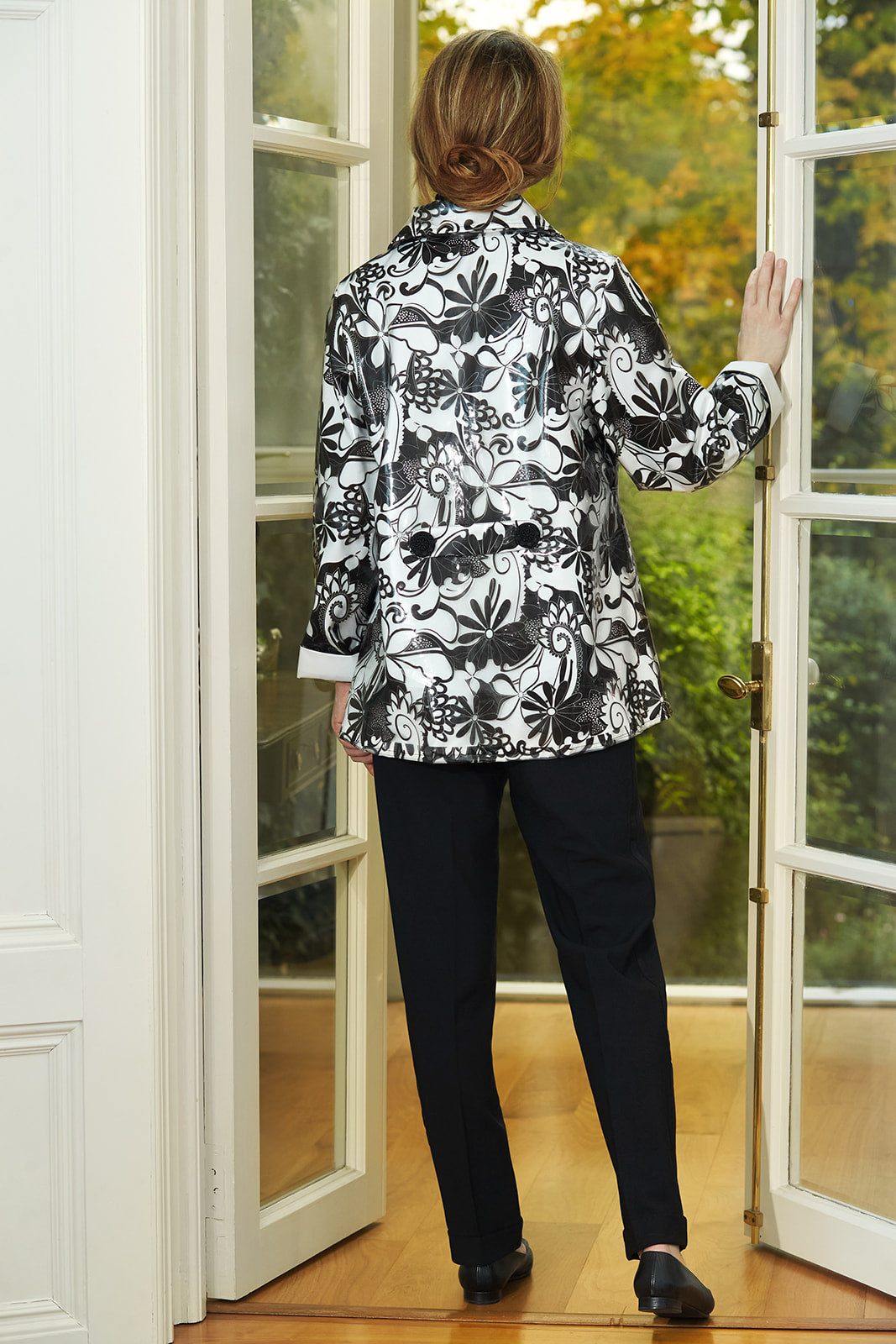 Embrace the artistry of monochrome, crafted from shower-proof fabric, this jacket showcases a striking black and white floral pattern that makes a bold statement. The intricate design weaves a tapestry of flowers and leaves in a stunning contrast that's both eye-catching and elegant.